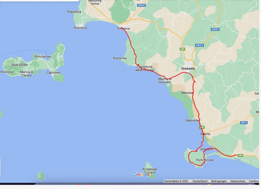 08.04.2023 In der Nacht hat es in Strömen geregnet und auch die erste Hälfte des Samstags regnete es immer wieder. Wir nutzten den Tag für Einkaufen im Supermarkt und sind nach Porto Santo Stefano gefahren. Dort haben wir mittags leckere Spagetti Frutti di Mare gegessen. Danach haben wir einen Spaziergang auf den Monte Argentario gemacht.