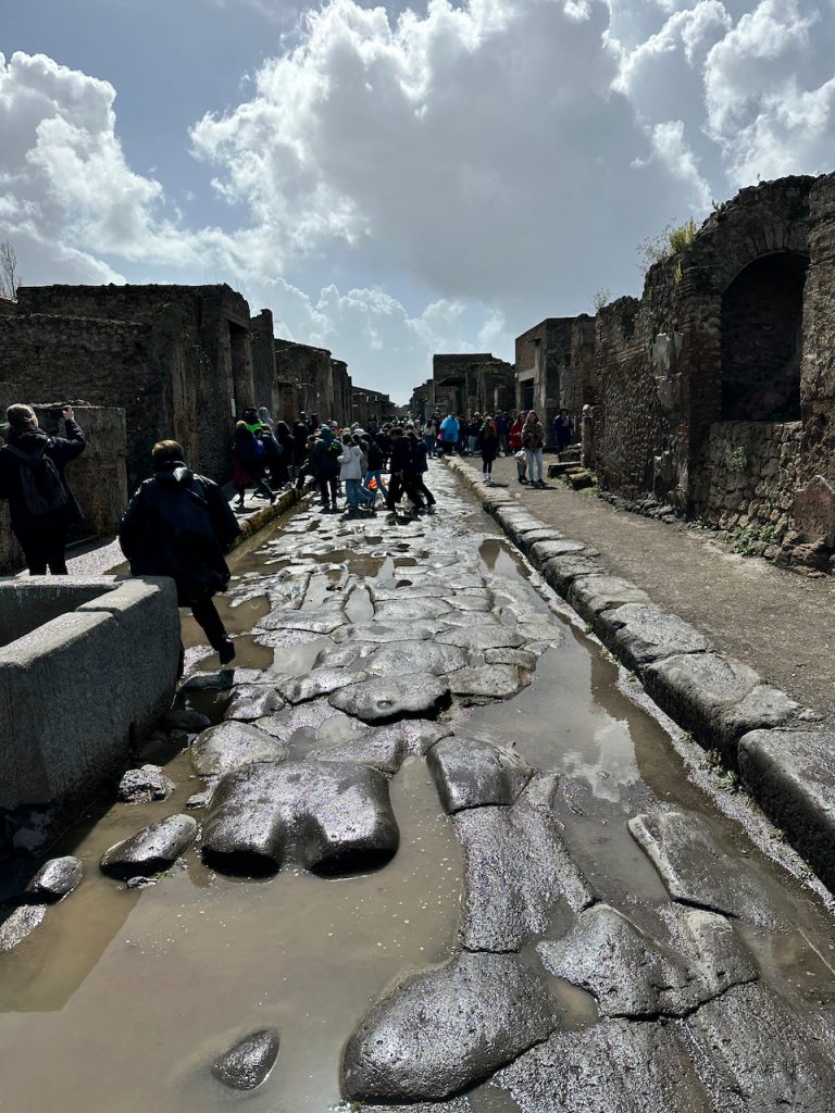 14.04.2023 Es hat den ganzen Tag geregnet und gehagelt. Für den späten Nachmittag soll der Regen zumindest etwas nachlassen und gegen Abend ganz aufhören. Der letzte Einlass zur Ausgrabungsstätte von Pompeji ist um 15.30 Uhr. Wir brechen also gegen 14.45 Uhr an unserem Campingplatz auf und machen uns auf den Weg in die Stadt zur Ausgrabungsstätte. Auf dem Weg mußten wir immer wieder Schutz unter Überdachungen und dergleichen vor besonderes schweren Regengüssen suchen. Aber am Ende schaffen wir es noch eingelassen zu werden. Tatsächlich hat dann immer mal wieder die Sonne geschienen aber es gab auch noch den einen oder anderen Regenguss. Aber der Besuch hat sich wirklich gelohnt und uns für die nassen Füße und Socken belohnt.