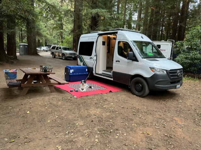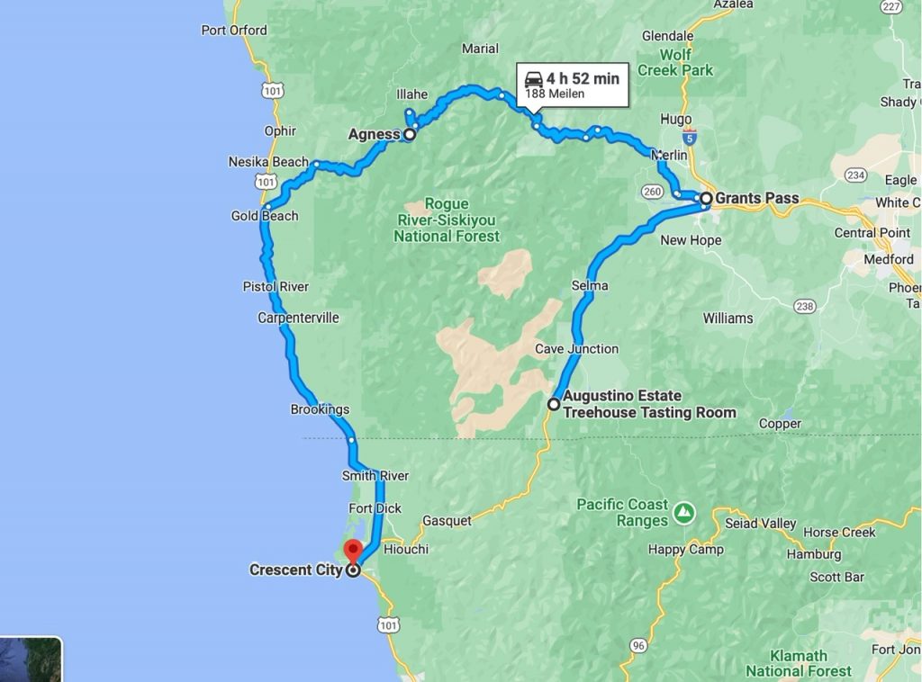 19.08.2023 Nach einem Morgenspaziergang durch das Weingut und einer Familien-Geburtstagsfacetimekonferenz mit Heike und Jojo bin ich zurück nach Grants Pass gefahren. Von dort ging es über eine kleine, teilweise nur eine Fahrspurbreite Bergstraße, die Bear Camp Road durch den Roque-River-Siskiyou National Forest an die Pazifikküste bei Gold Beach. Von dort dann den HW 101 Richtung Süden bis nach Crescent City in Kalifornien. Auf dem Redwoods-RV-Resort haben wir dann einen Stellplatz für die Nacht gefunden.